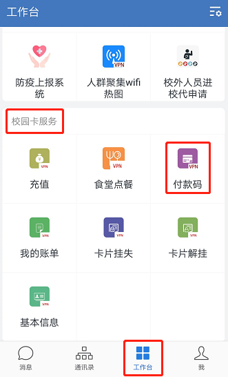 2. 选择“工作台”—"校园卡服务”—"付款码”