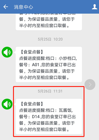 4. 取餐:请关注企业号中的“食堂点餐“消息,并尽快去食堂窗口凭订单信息取餐。