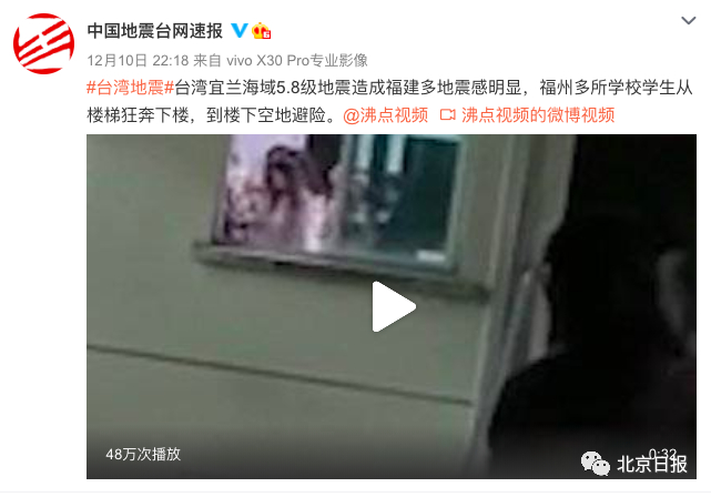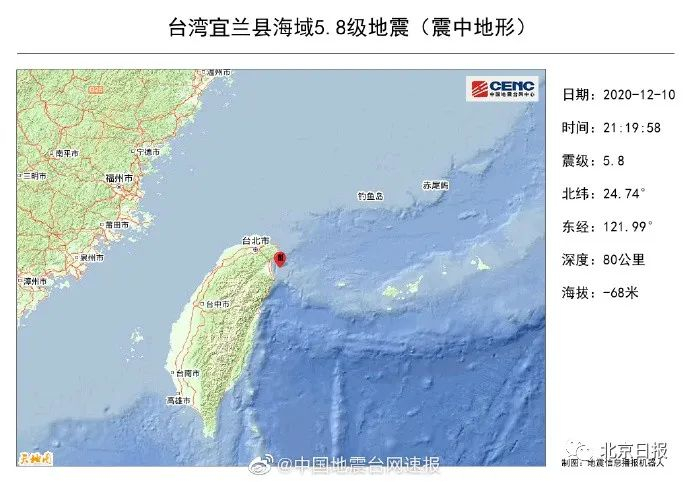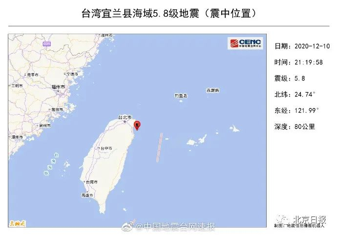 12月10日21时19分,台湾宜兰县海域(北纬24.74度,东经121.99度)发生5.8级地震,震源深度80千米。地震造成台北震感强烈,全岛震感明显,福建福州、厦门、泉州等地亦有明显震感。