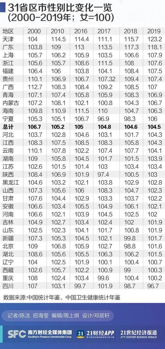 不过,从各地来看,性别比的情况并不一致。2019年,31个省区市中,20地省区市的性别比低于全国平均水平,其中四川以96.7的性别比,位列全国性别比最低的地区,也是唯一一个女多男少的地区。