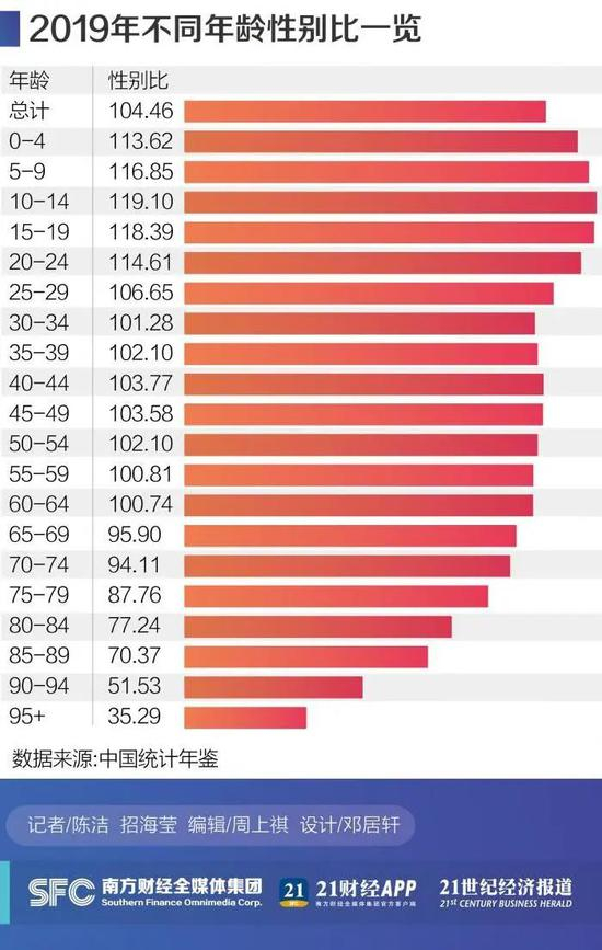 “总人口的性别比其实和年龄有很大的关系,根据出生和死亡的规律,一般年龄小的时候男性多,到婚龄的时候男女基本平衡,然后年龄越大女性越多,因此中国的老龄化越严重,对整个人口的性别比的影响是趋于平衡的。”杨舸表示。