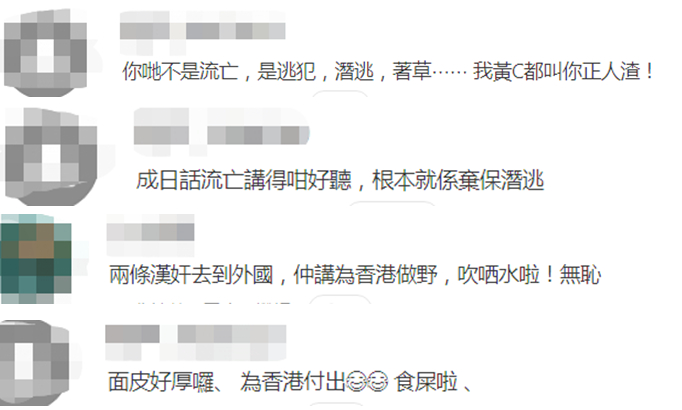 有网友批他们:“不是‘流亡’,是逃犯、潜逃、着草⋯⋯我黄丝都叫你人渣!”“成天讲‘流亡’讲得好听,其它就是弃保潜逃。”↓