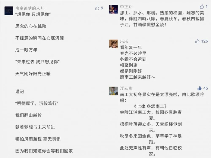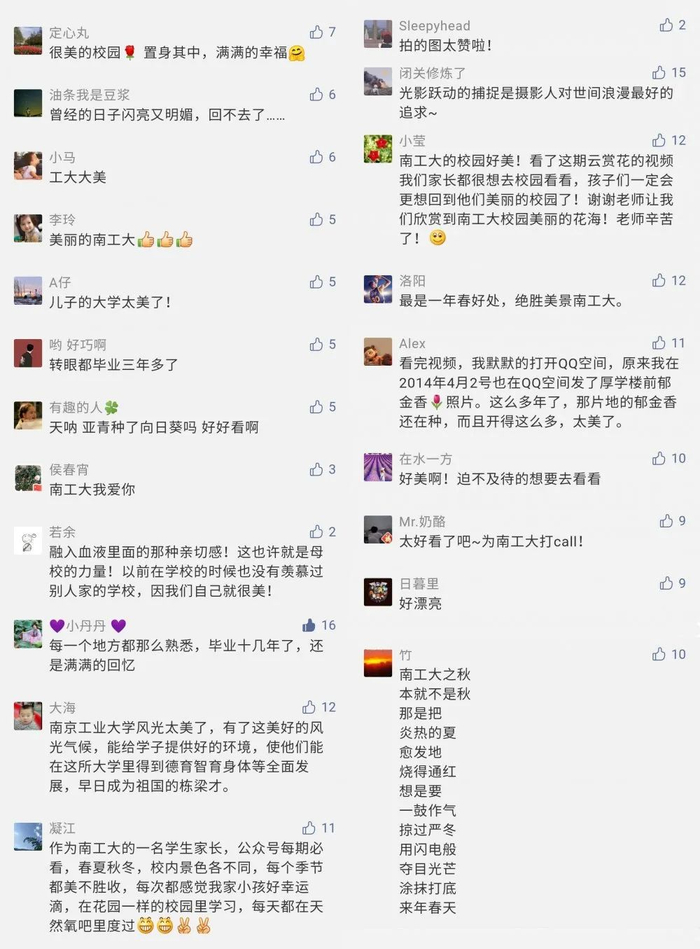 阅官微可赏秀色:赏春之繁花,赏秋之落叶,赏夏之芙蕖,赏冬之飞雪,赏南工之四季也;阅官微可识人才:识师道大爱,识学子风华,识校友宏业,识教授钻研,识校园之榜样也;阅官微可证天道:证民族崛起、证校史峥嵘、证初心使命、证青春担当,证天地之大道也。