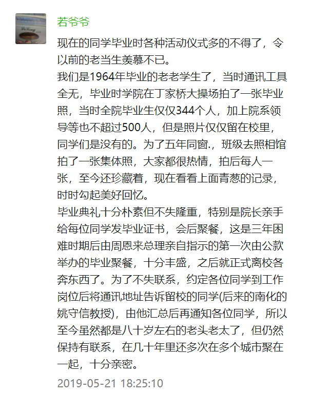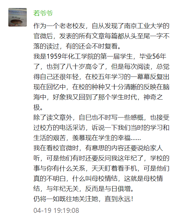如今的若爷爷已经接近八十岁了,可是他却一直关注着南京工业大学的微信公众号,成为了最铁杆的粉丝之一。每一次他在评论里写自己的回忆,就是一大段一大段。六十年前的美好,如今悉数沉淀在他的记忆里。每次提及,他都要讲好久好久。他怀念母校的槐花树,怀念金工实习的时光,怀念自己去照相馆给同学们洗照片的经历……