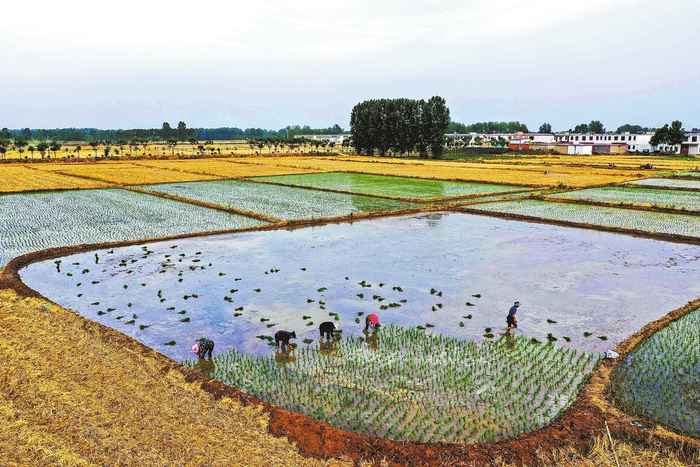 图⑥麦收后,正阳县大林镇涂店村村民正忙着插秧。