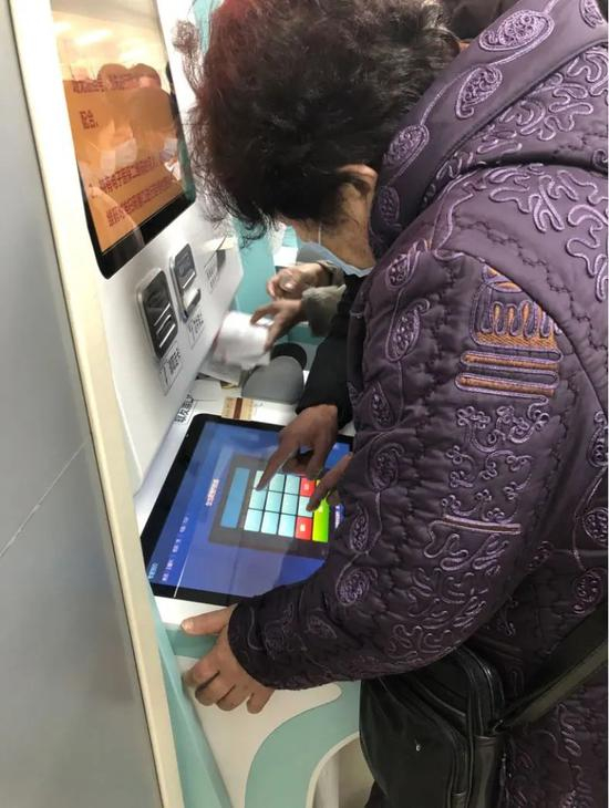 肺科医院门诊大厅内最左侧的一台自助机器前,一对老年夫妇插卡后,两人都将手悬在了屏幕上方,但却不知道该按哪个按钮。