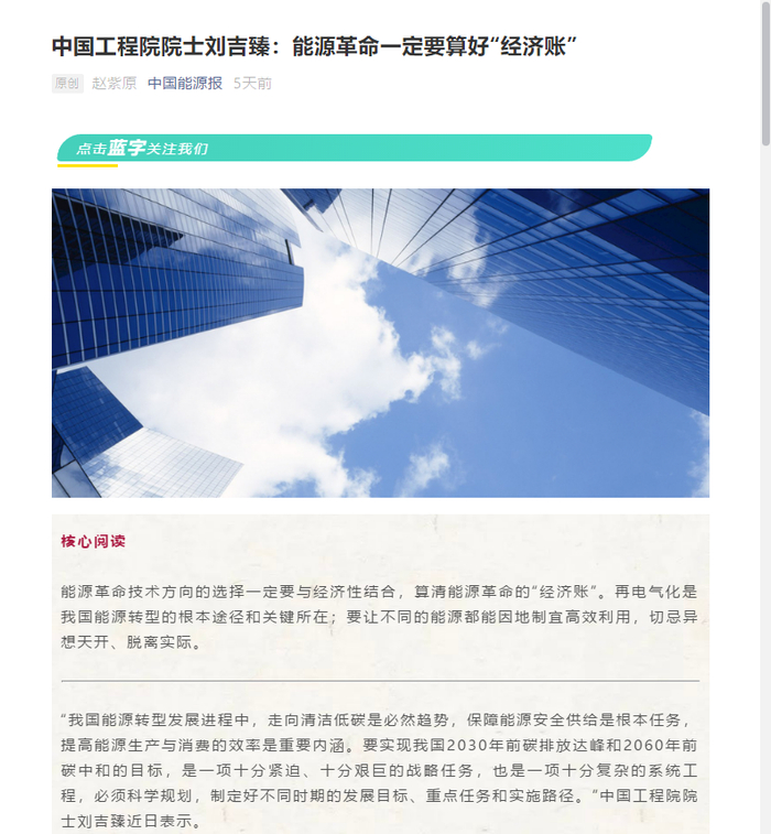 近日,我校刘吉臻院士接受中国能源报专访。他指出,面向2035年的能源发展战略思路为“化石能源清洁化、清洁能源规模化、多种能源综合化”。“这三者相辅相成,既不能相互割裂,也不能各自为政、忽略相互的支撑作用。其中,值得注意的是,能源革命技术方向的选择一定要与经济性结合,算清能源革命的‘经济账’。在能源消费侧,再电气化是我国能源转型的根本途径和关键所在。”
