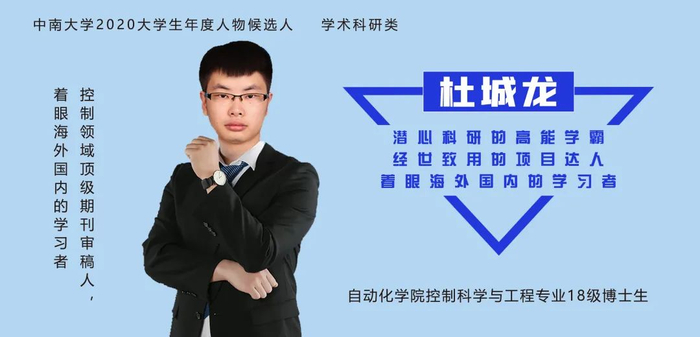 他是踏实的科研人,以第一/第二作者发表了SCI一区论文6篇,其中两篇入选2019年ESI前0.1%热点论文,三篇入选2020年ESI前1%高被引论文,Web of Science共引用180次,Google学术共引用236次,目前担任10余个控制领域顶级期刊审稿人。他是勇敢的实践者,参与多个国家自然科学基金项目以及五矿铜业、航天五院等多个项目,目前在加拿大维多利亚大学博士联合培养。