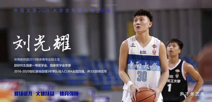 他是赛场上技艺超群奋勇争先的热血运动健儿,以核心球员的身份带领中南大学男子篮球队在CUBA一级联赛中一鸣惊人屡创佳绩,带领中南大学男子篮球队于2016年至2020年史无前例地连续5年获得了CUBA“西南王”称号、2016-2020创纪录地连续5年带队闯入CUBA全国四强,并3次获得亚军;他品学兼优,获研究生国家一等奖学金、国家奖学金荣誉。
