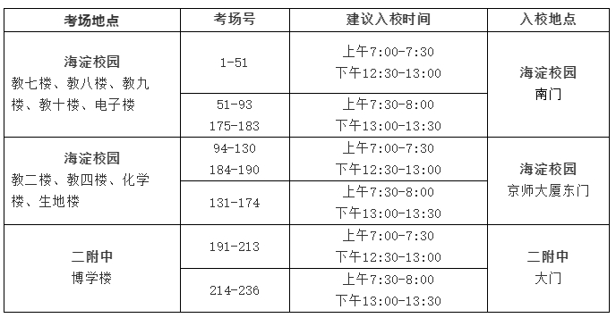 3. 体温检测,准考证、身份证查验,核酸检测阴性报告验证,绿色健康码核查环节将需要一定时间,请考生务必预留充足时间提前到达考点,有序排队,并听从现场工作人员引导与指挥。海淀校园南门、京师大厦东门至最远考试楼步行时间约为15分钟。