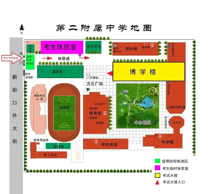4. 考试期间气温较低,海淀校园考生可至敬文讲堂(位置见上图1),二附中考生可至休息室(位置见上图2)候考。考前半小时方可进入考试楼。