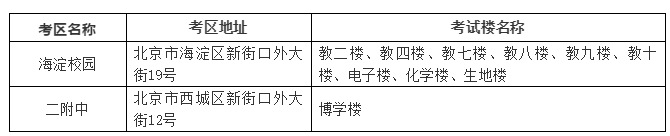我校设置北京师范大学海淀校园(以下简称海淀校园)和北京师范大学第二附属中学(以下简称二附中)两个考区,共10个考试楼,详情如下(各考试楼位置示意图见附图1、2):
