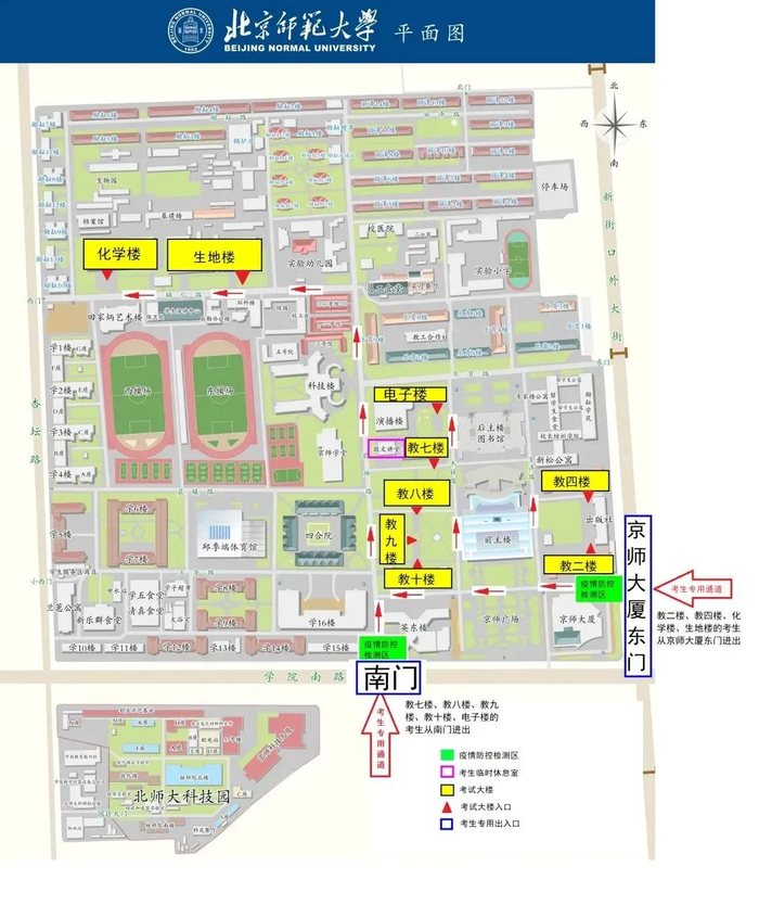 1. 12月26日-27日上午7:00开始,下午12:30开始,在海淀校园考试的考生在校园南门、京师大厦东门进行防疫检测,检测合格后方能进入校园考试(注意:校园其他校门不设防疫检测点,考生无法通行);二附中考生由二附中大门进入校园,进行防疫检测。