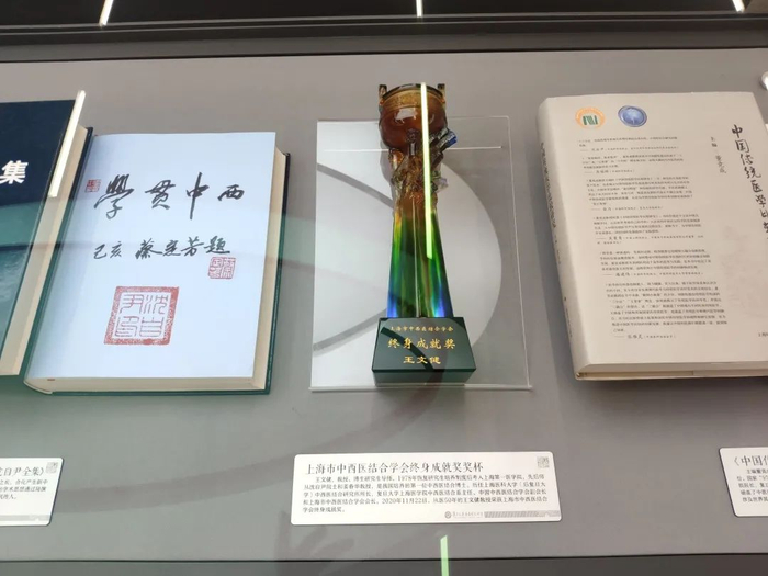 展厅里,作为由沈自尹培养的新中国首位中西医结合博士,王文健新近获得的“上海市中西医结合学会终身成就奖”奖杯是对授业恩师最好的汇报和回报。