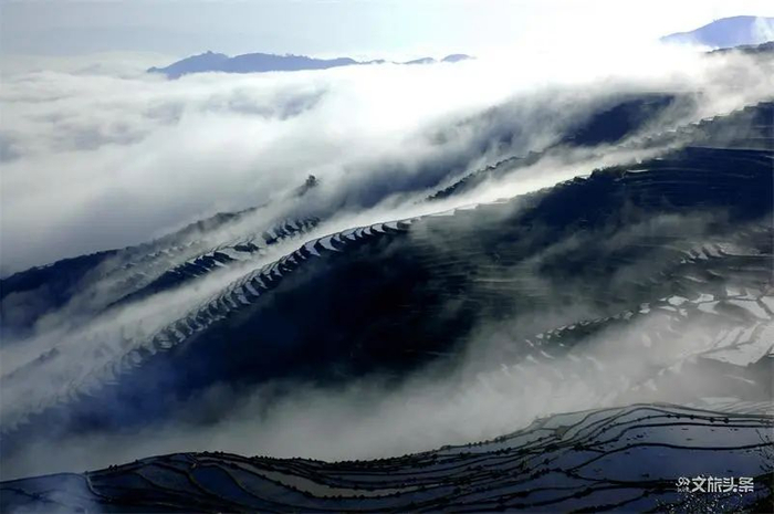 阳光穿过云雾,晨风吹散白纱,静谧安然的古村寨在缭绕的雾气中逐渐显现,置身其间,宛如人间仙境,轻纱下那波光粼粼、延绵不绝的梯田景观更是让人叹为观止。