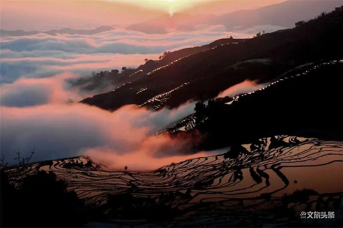 元江县羊街乡、那诺乡哈尼云海梯田是红河流域最古老的梯田,梯田随四季更迭换景,尤以冬春季节最为神奇壮美。当梯田与云海相会,奔腾的云海与错落有致的梯田相依相偎,一动一静间,变化万千,日出霞红之时,更加奇幻夺目。