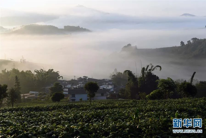 冬季,云南省普洱市思茅区永庆茶园周边山峦云雾飘渺,景色如画。