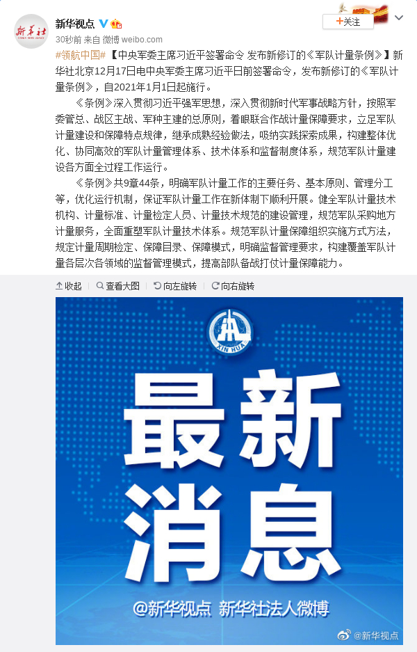 新华社北京12月17日电中央军委主席习近平日前签署命令,发布新修订的《军队计量条例》,自2021年1月1日起施行。