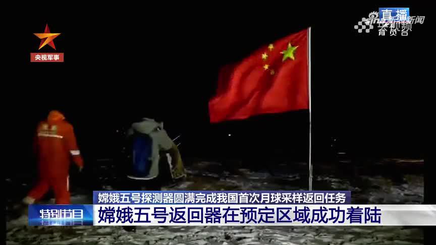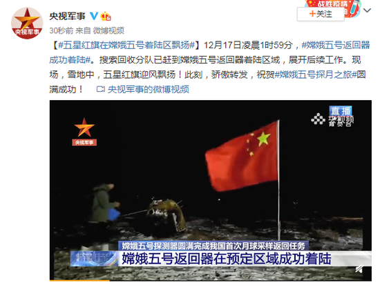 12月17日凌晨1时59分,嫦娥五号返回器成功着陆。搜索回收分队已赶到嫦娥五号返回器着陆区域,展开后续工作。现场,雪地中,五星红旗迎风飘扬!此刻,骄傲转发,祝贺嫦娥五号探月之旅圆满成功!