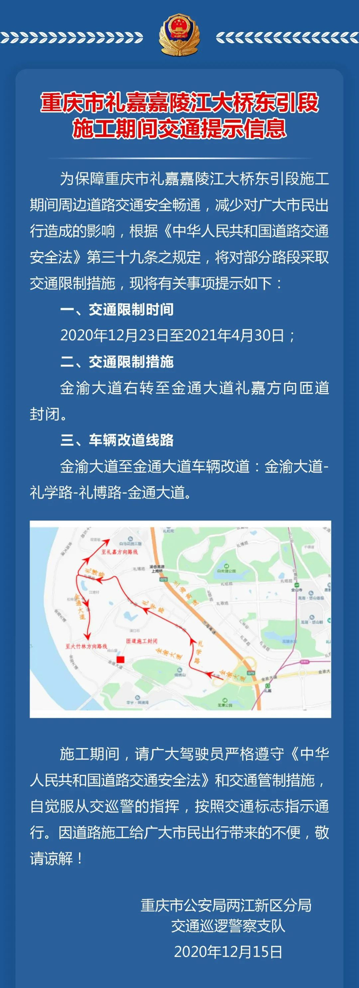 重庆市公安局两江新区分局交通巡逻警察支队发布重庆市礼嘉嘉陵江大桥东引段施工期间交通提示信息。为保障重庆市礼嘉嘉陵江大桥东引段施工期间周边道路交通安全畅通,减少对广大市民出行造成的影响,根据《中华人民共和国道路交通安全法》第三十九条之规定,将对部分路段采取交通限制措施,现将有关事项提示如下: