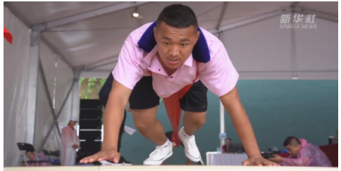 押加是传统的民族体育项目,又被称为“桂式拔河”,被列为全国民运会表演项目。押加选手背对背进行比赛,用躯干部位“拔河”,因模仿大象,又称为“大象拔河”。押加更多靠的是腿、腰、肩、颈等的力量与发力技巧。光有体重可不行哦,坚持住,我们能赢!