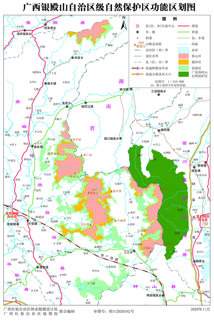 一、同意广西银殿山自治区级自然保护区(以下简称保护区)功能区划。保护区总面积为38268公顷,其中核心区面积为13347.7公顷、缓冲区面积为5859.9公顷、实验区面积为19060.4公顷。