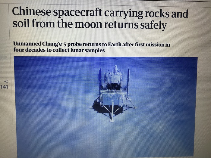 英媒:中国嫦娥五号成功返回地球 国际探月实践或再次盛行