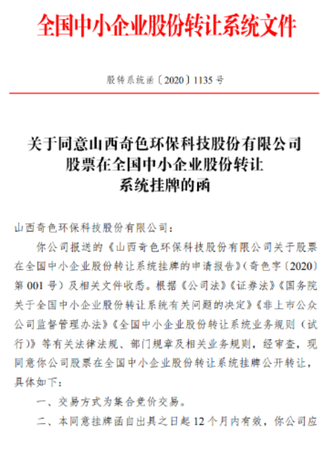 奇色环保公司新三板上市批准函