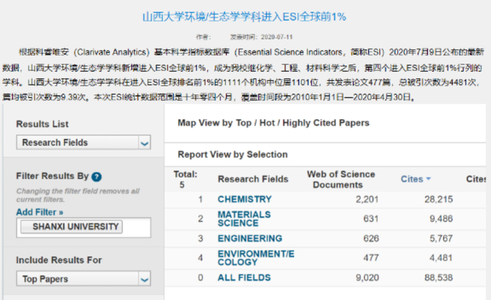 环境生态学科进入ESI全球前1%