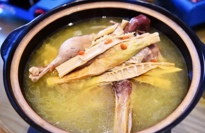 笋干老鸭煲由天目山里刚拗的笋干、隔年的老鸭、陈年火腿,再辅以独特的香料熬制而成……