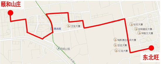 中途设站:颐和山庄、永靓家园南、西北旺西路、永丰南路、茉莉园南路、百旺新城、中海枫涟山庄北门、夏霖园、春晖园、后厂村路、后厂村东、软件园北站、东北旺西路北口、软件园西区、东北旺路西口(开往东北旺方向)、东馨园南门(开往颐和山庄方向)、东北旺。