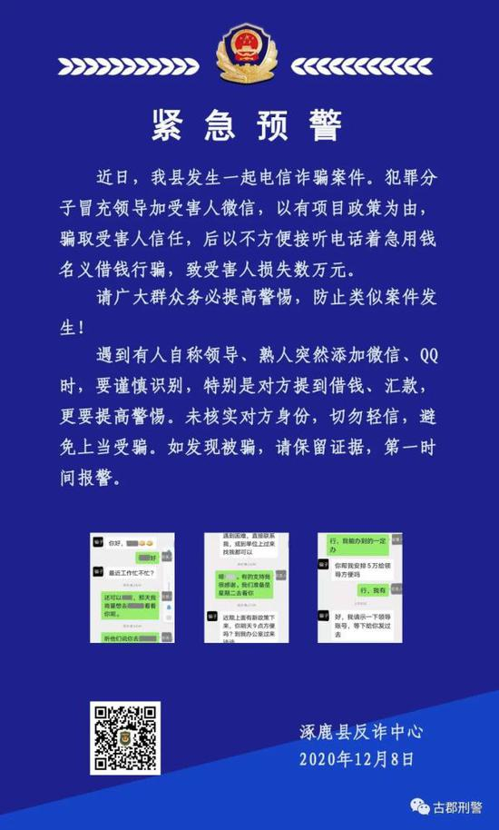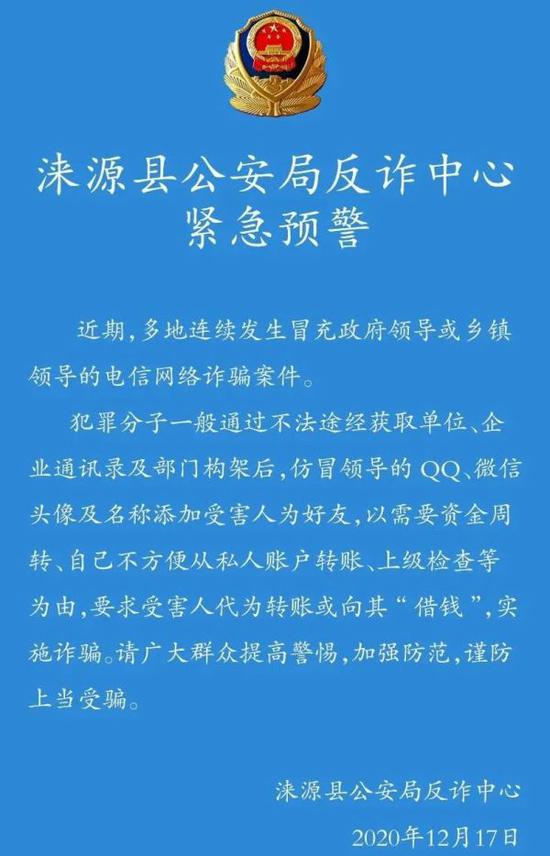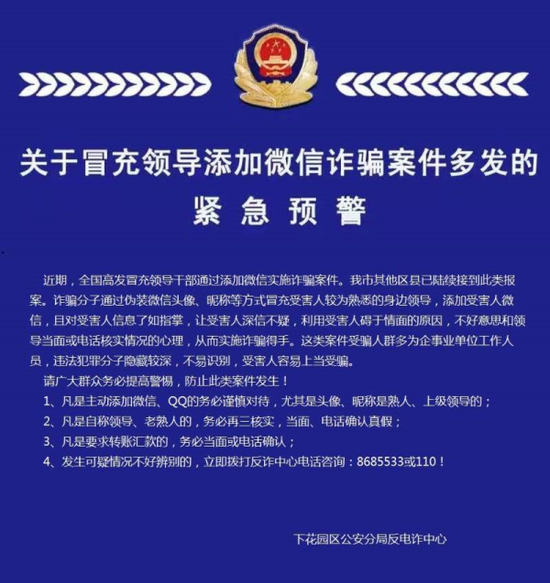 河北多地发生以冒充县领导、乡镇领导进行诈骗的犯罪活动,诈骗分子通过网络搜索辖区公司、企业及其他相关经营单位法人、负责人电话,添加微信,并以借款给他人要求代为转账为由实施诈骗。当地公安局发出紧急预警。