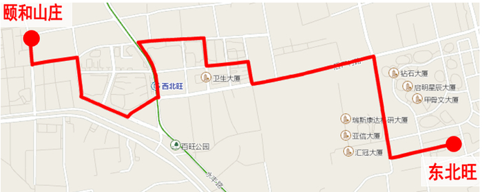 中途设站:颐和山庄、永靓家园南、西北旺西路、永丰南路、茉莉园南路、百旺新城、中海枫涟山庄北门、夏霖园、春晖园、后厂村路、后厂村东、软件园北站、东北旺西路北口、软件园西区、东北旺路西口(开往东北旺方向)、东馨园南门(开往颐和山庄方向)、东北旺。