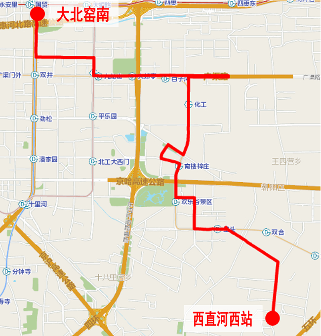 中途设站:西直河西站、西直河中街、西直河北站、工业技师学院、垡头南站、地铁垡头站、北京华侨城南站、北京华侨城北站、金蝉北路西口、紫南家园、紫南家园北站、广化大街南口、广化大街、地铁化工站、唐家村(东行,开往大北窑南方向)、唐家村、地铁百子湾站(开往大北窑南方向)、东石门、大郊亭桥东(开往西直河西站方向)、大郊亭桥西、九龙山路口东、九龙山、苹果社区东、苹果社区、百子湾南二路西口、双花园、大北窑南。