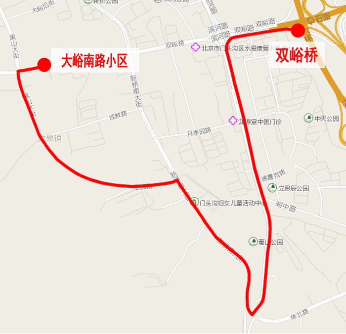 中途设站:大峪南路小区、西山艺境小区、桃园小区、月季园小区(开往双峪桥方向)、葡萄嘴、葡萄嘴环岛北、葡东小区、倚山嘉园、承泽苑、侯庄子、双峪桥。