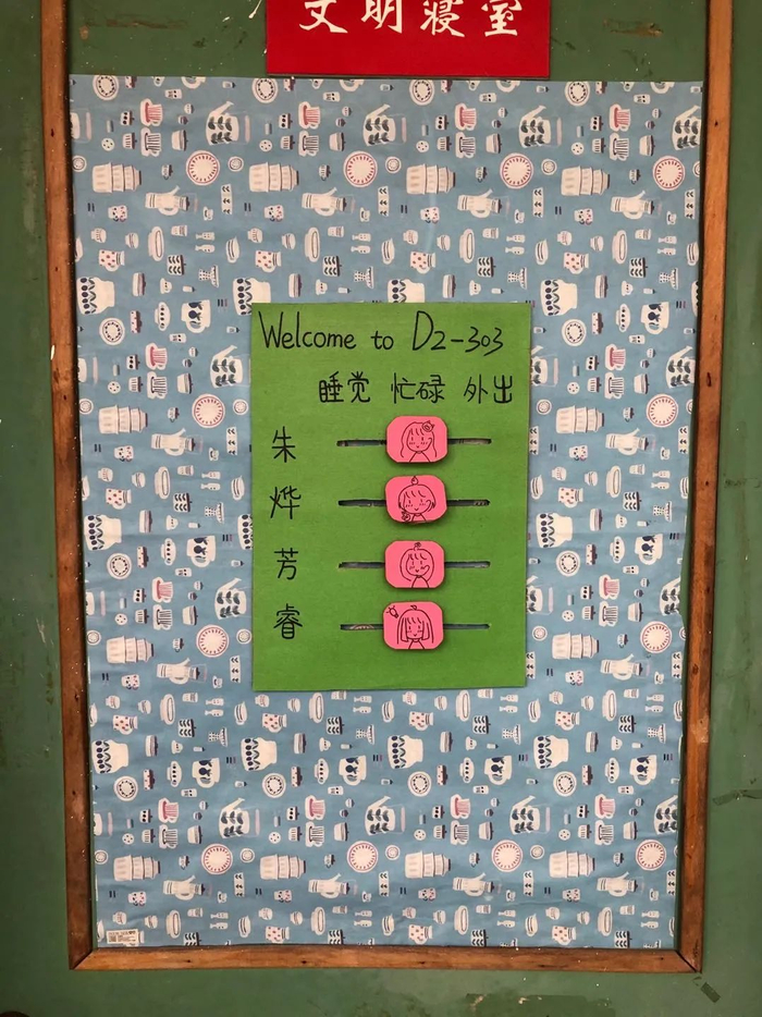 春夏秋冬,这是我们寝室的特色体现的点睛之笔,我们寝室每个人的性格对应一个季节,春者,温也,明媚活跃;夏者,阳也,热情乐观;秋者,丰也,幽默善良;冬者,静也,稳重自立。性格互补,做事就可以事半功倍。每天早上,每人一两片柠檬,一勺蜂蜜,搬起小板凳,沏一杯酸酸甜甜的柠檬蜂蜜水,开始繁忙而又充实一天;中午,彼此分享听闻的趣事,学习竞赛的情况;晚上,在忙完各自的作业以后,四个人席地而坐,开始晚上的娱乐活动!可能会是你画我猜的小游戏,也有可能是激动人心的UNO!在欢声笑语中,结束忙碌的一天。我们的寝室生活就像四季一般平淡,但平淡中的每个人却又像四季一般各具特色。