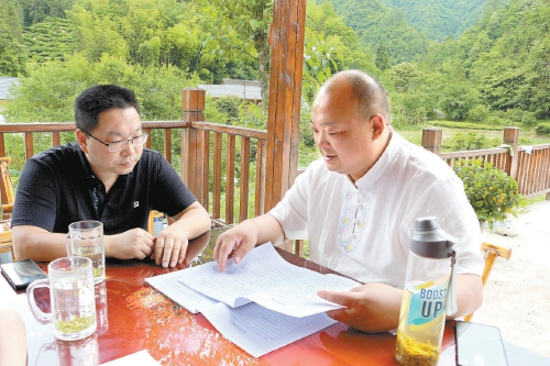 湖北省鹤峰县检察院检察长谭远磊走访宋庆礼代表(右),就优化营商环境服务民营企业发展征求意见建议。