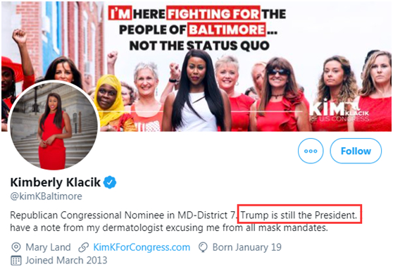值得注意的是,这位刚刚参选国会议员失败的克拉奇克一直以来都是特朗普的忠实拥趸。在推特介绍中,她还特意强调“特朗普现在仍然是总统”,近期发推时也多次宣称此次大选“不公平”、存在“选举舞弊”。