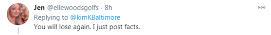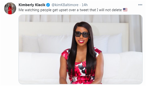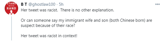 “我今天晚上在推特上让这么多人生气愤怒,但我其实一点不在乎,”她在推特上写道,并狡辩称“指出一些人是中国人并不是种族主义,指出我自己是黑人也不是种族主义。”她还表示自己不会删除推文。