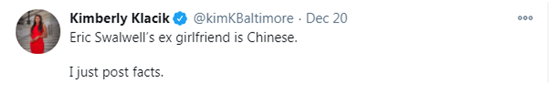 “埃里克·斯沃威尔(民主党众议员)的前女友是中国人。我只是陈述事实。”↓