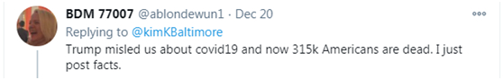 “特朗普在新冠这件事上误导了我们,现在有31.5万美国人失去了生命。我只是陈述事实。”