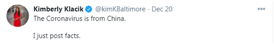 在这条推文中,克拉奇克抹黑称“新冠病毒来自中国”,并坚持声称自己是在“陈述事实”。