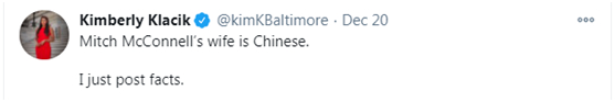 “米奇·麦康奈尔的妻子是中国人(华裔)。我只是陈述事实。”↓