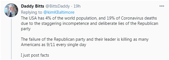 “美国有着世界4%的人口,但新冠死亡人数却占全球死亡病例的19%,这是共和党人惊人的无能和故意说谎所导致的。共和党及其领导人的失败,每天杀死的美国人比得上9·11事故。我只是陈述事实。”