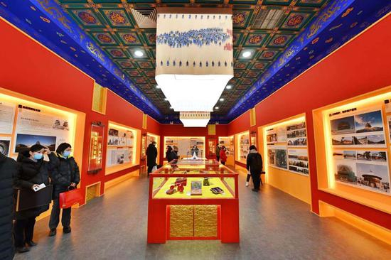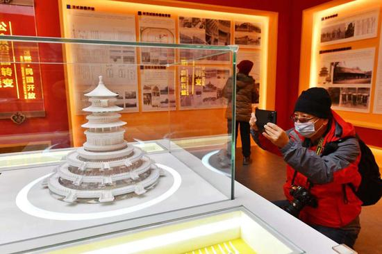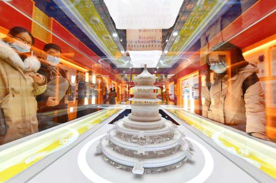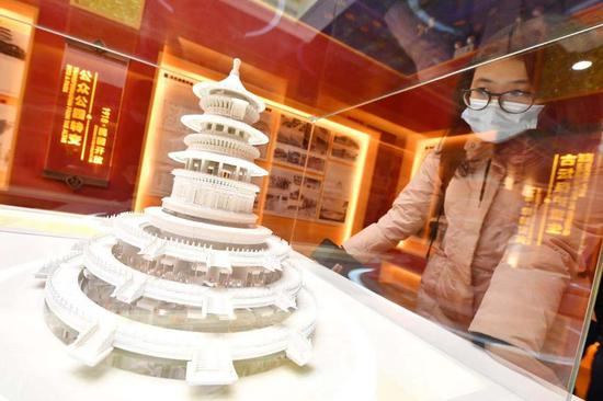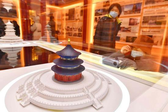 今天上午,记者来到祈年殿西配殿看到,展览设计上突出天坛特点,主体色调根据祈年殿的建筑风格,选用青、金、红色。展厅设置两个展柜,分别展示祈年殿模型和天坛特色文创产品。