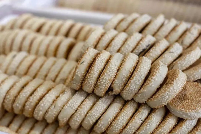 麻饼形如满月、色泽金黄、入口香甜。唐时白居易曾写到“胡麻饼样学京都,面脆油香新出炉。寄与饥馋杨大使,尝得看似辅兴无。”