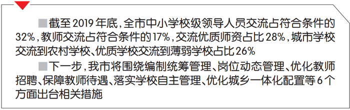 市教委相关负责人介绍,2017年我市已基本实现全市区县域内中小学校长教师交流轮岗制度化、常态化。截至2019年底,全市中小学校级领导人员交流占符合条件的32%,教师交流占符合条件的17%,交流优质师资占比28%,城市学校交流到农村学校、优质学校交流到薄弱学校占比26%。