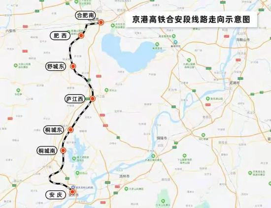 京港高铁合安段位于安徽省西南部,北起安徽省会合肥,向南经肥西、舒城、庐江、桐城、怀宁等市县,终至安庆市。线路全长176公里,设计时速350公里,共设合肥南、肥西、舒城东、庐江西、桐城东、桐城南、安庆7座车站。
