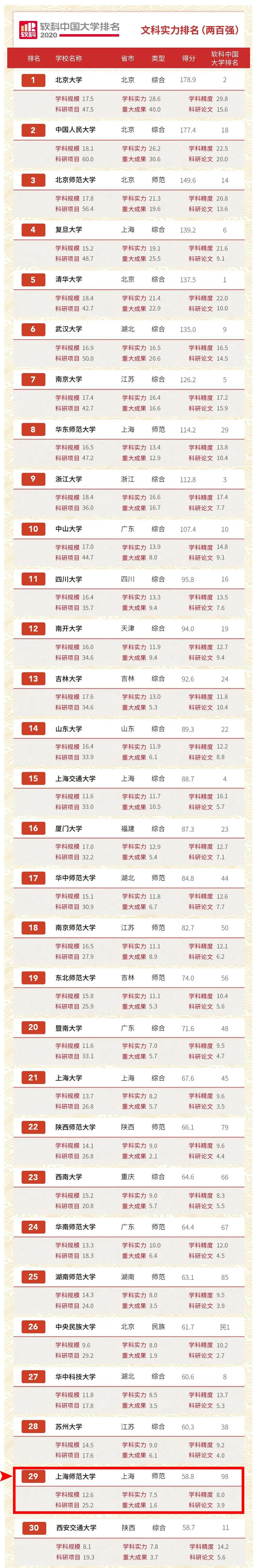 上海师范大学在2020软科中国大学排名——文科实力排名居于前三十强。