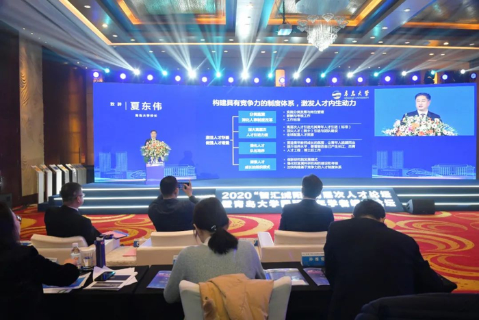 夏东伟在致辞中介绍了青岛大学多源汇流、以“大师”育“未来大师”的办学历史,以及近年来学校在人才培养、科学研究、服务地方、传承创新优秀文化等方面取得的成绩,着重就新时代背景下如何“坚持以规划引领高质量发展;坚持把人才作为支撑发展的第一资源,构建具有竞争力的制度体系,激发人才内生动力;坚持自主创新,服务区域经济社会发展”进行了阐述。